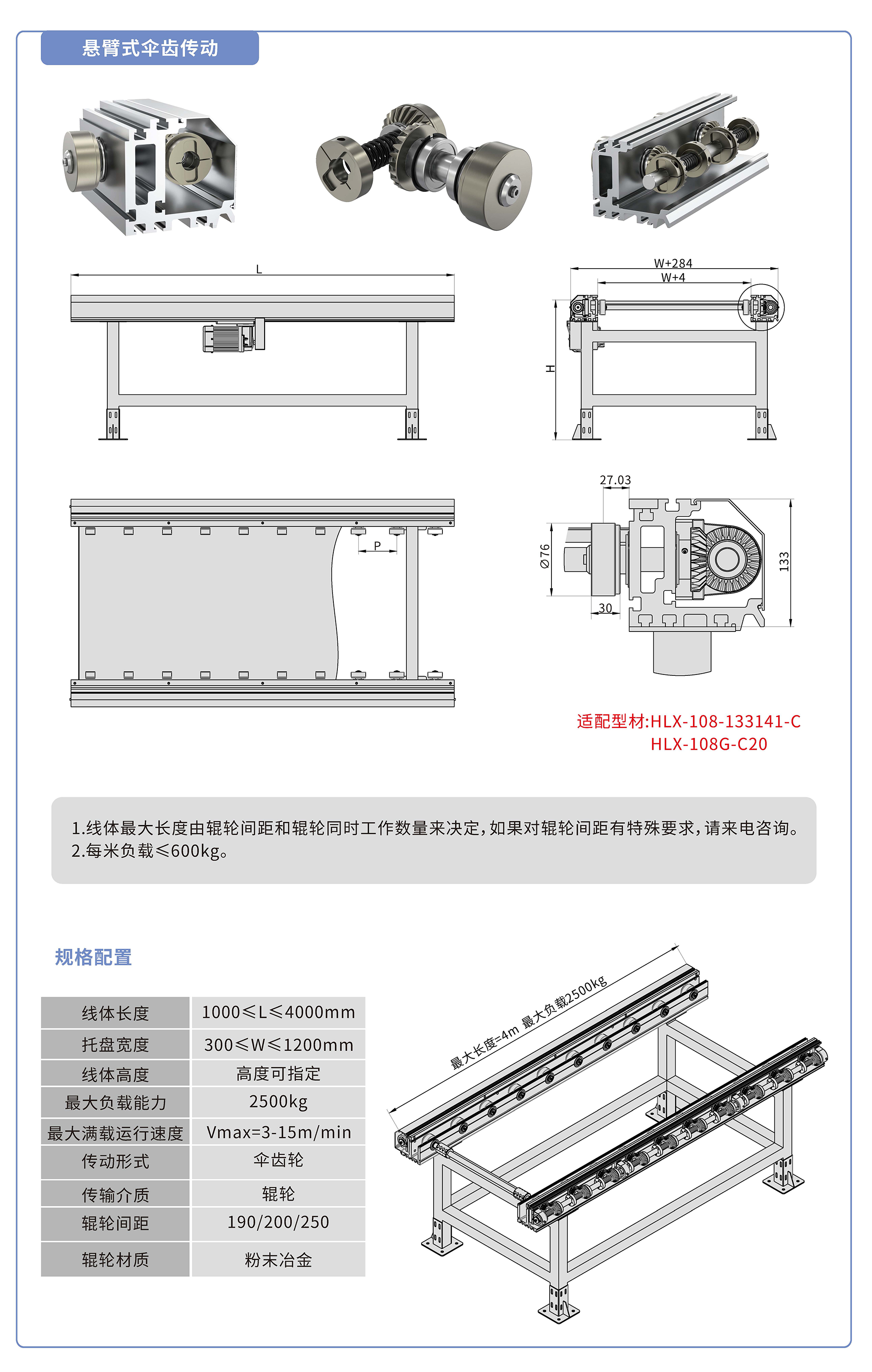 采用133141鋁型材,傘齒驅(qū)動(dòng),粉末冶金滾輪鑲嵌銅套實(shí)現(xiàn)積放功能,負(fù)載2500kg/米,最大負(fù)載速度15M/min, 輪距190、200、250可選,適用托盤寬度300-1200mm,線體長度范圍1000-4000mm, 高度根據(jù)需求定制.