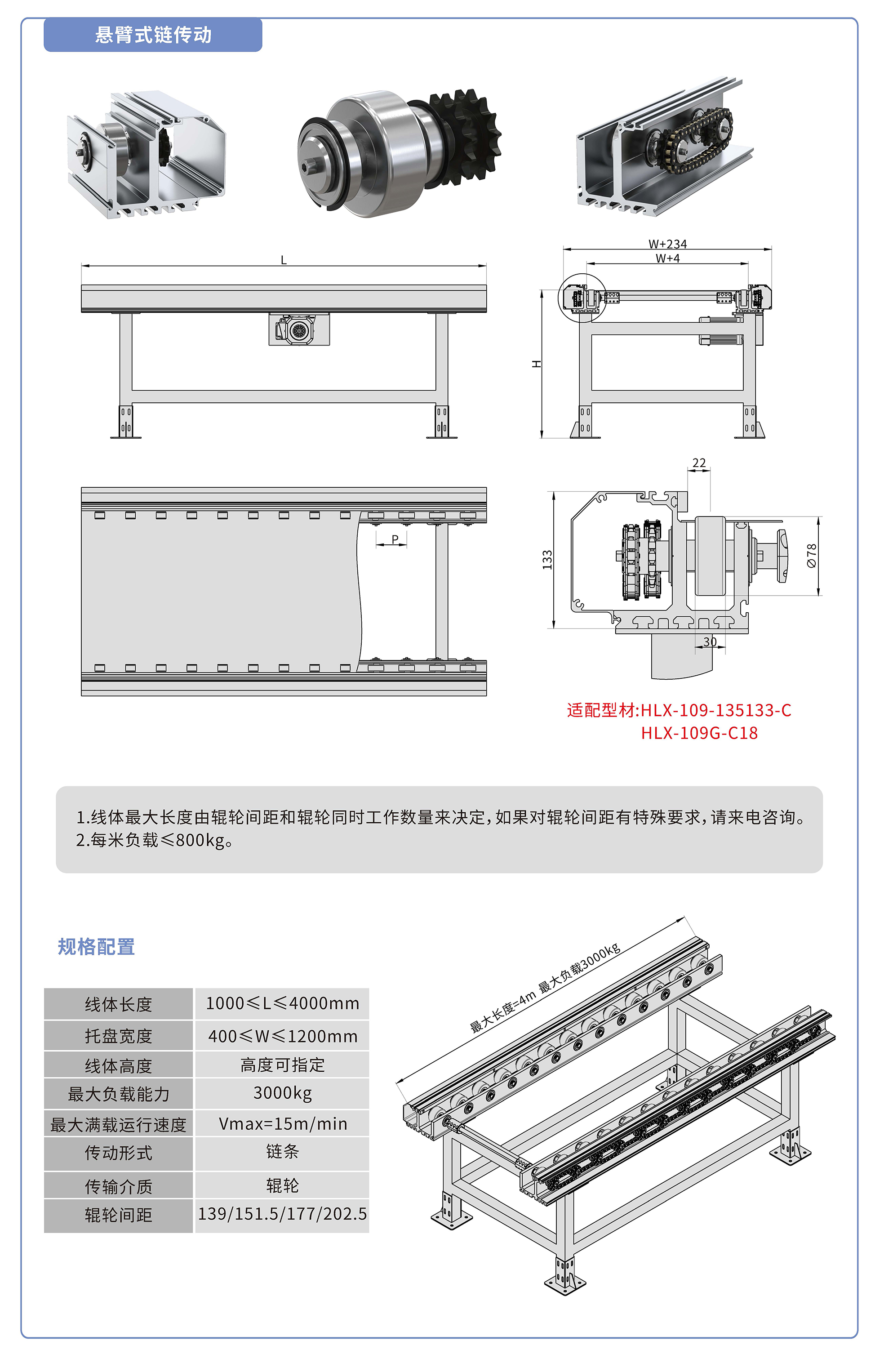 采用135133鋁型材,鏈輪傳動(dòng),鍍鉻滾輪鑲嵌銅套實(shí)現(xiàn)積放功能,負(fù)載3000kg/米,最大負(fù)載速度15M/min, 輪距139、151.5、177、202.5可選,適用托盤寬度400-1200mm,線體長度范圍1000-4000mm, 高度根據(jù)需求定制.