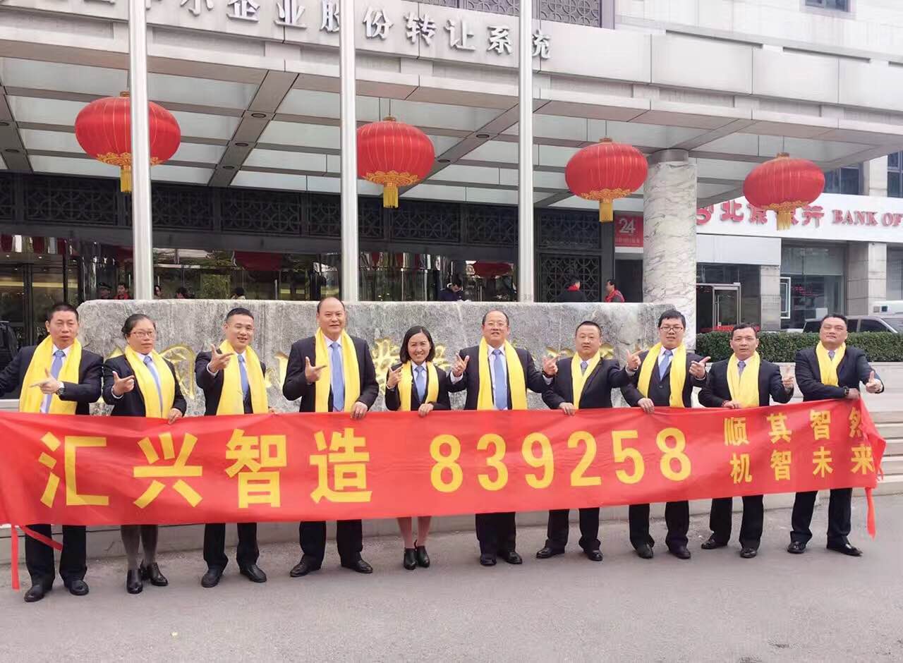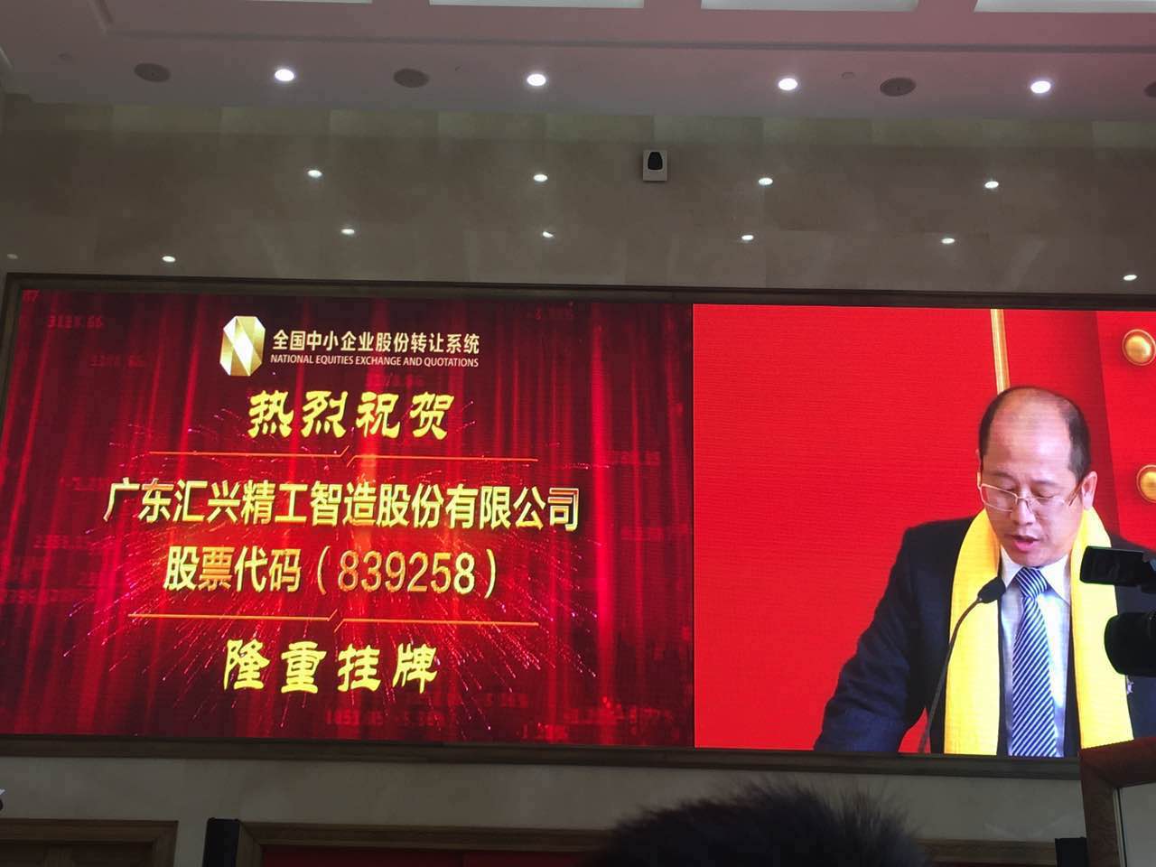 2016年11月1日上午10點,廣東匯興精工智造股份有限公司(股票代碼:839258)以下簡稱匯興智造,在全國中小企業(yè)股份轉(zhuǎn)讓系統(tǒng)儀式大廳隆重舉行掛牌上市儀式。參加此次掛牌事宜內(nèi)部嘉賓主要代表有鐘輝董事長、昆山公司鐘世鑫總經(jīng)理、重慶公司胡偉路總經(jīng)理、李福生總經(jīng)理、呂常垣總經(jīng)理、鄧高全總監(jiān)等董監(jiān)高10余人。由鐘輝董事長代表發(fā)言及敲鐘儀式。成為了中國資本市場上首家以“精工智造股份有限公司”名稱掛牌上市的企業(yè)。
