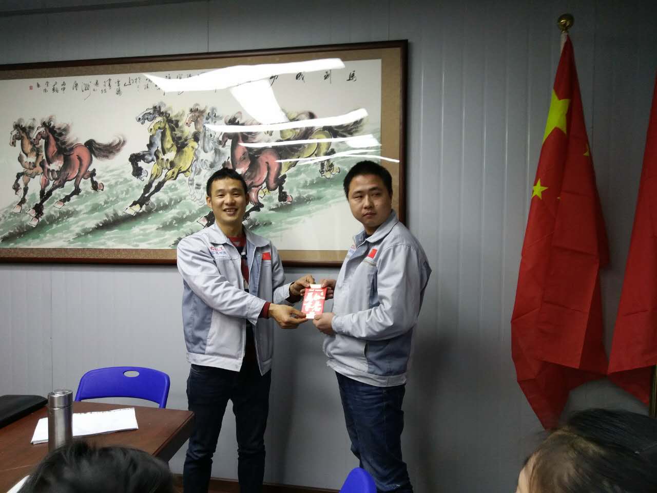 大會進行到尾聲,對每月度之星的選舉。胡總(圖左)為月度之星徐財華戰(zhàn)士(圖右)頒發(fā)獎金。同時感謝他對于公司的無私奉獻,對于同事的無微關懷,并擁護匯利興這個大家庭;同時匯利興還有很多人都在默默地奉獻與努力(例如:成都辦事處的張國桃經理,在今年6月17日與戰(zhàn)車傳奇進軍成都開疆擴土、奮戰(zhàn)近一年),在此感謝他無私的奉獻。匯興智造有著你們這群人的努力與付出,相信我們會更加靠近我們的夢,實現中國智能裝備全產業(yè)鏈集成智造標桿,繼續(xù)引領行業(yè)的發(fā)展。
