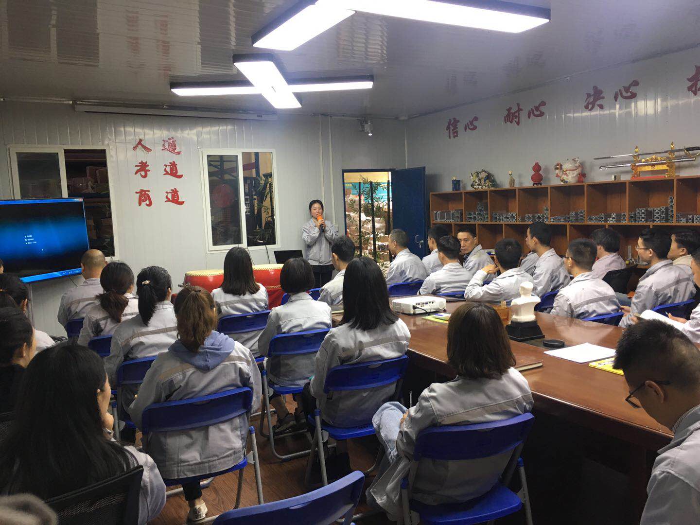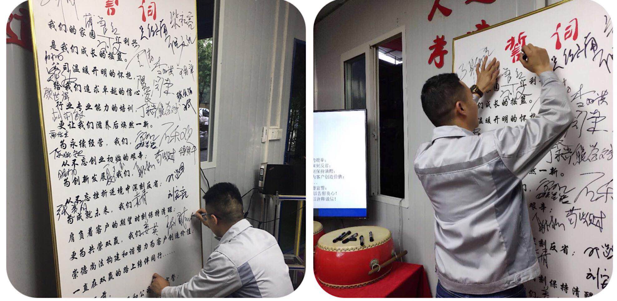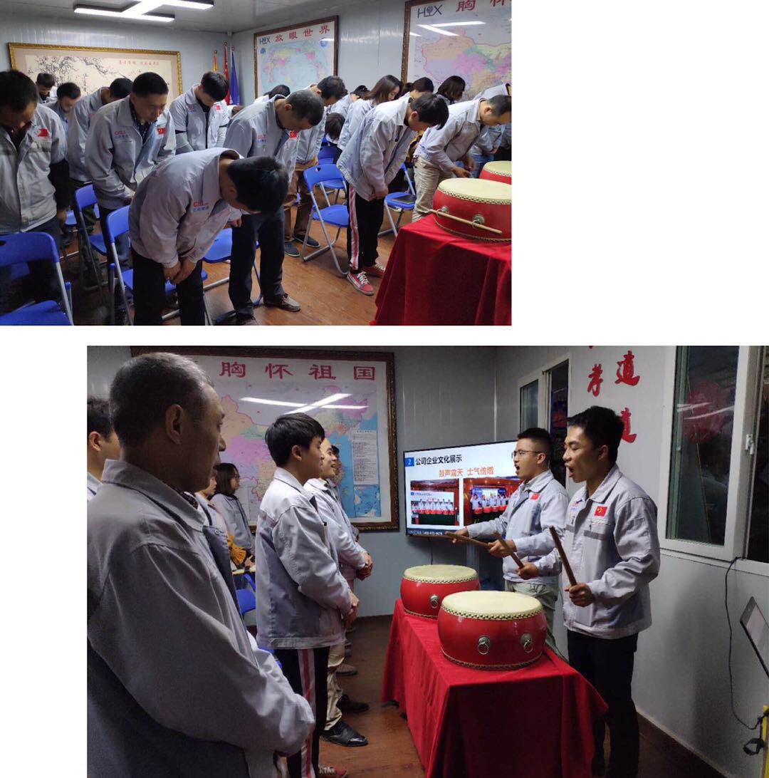 會議第二項議程,企業(yè)文化的展示。全體匯興人整肅衣冠對匯興人倍加推崇的“三道文化”(孝道、商道、人道)鄭重地鞠躬,莊嚴宣誓企業(yè)愿景:“成為全球領(lǐng)先的智能自動化產(chǎn)業(yè)鏈集成服務(wù)商”,企業(yè)使命:做受尊敬的好人,造受尊敬的產(chǎn)品,辦受尊敬的企業(yè),建受尊敬的平臺,企業(yè)精神“用情做人、用心做事”,團隊精神“忠誠團結(jié)、勤奮進取”,工匠精神:創(chuàng)于手、精于工、智于器、匠于心、品于行,行為準則:口中有德、目中有人、手中有技、心中有愛、行中有善,職業(yè)準則:對工作熱臉、對同事笑臉、對錯誤紅臉、對浪費黑臉、對榮譽爭臉。隨后二位核心精英擊士氣鼓,士氣比武器更重要,現(xiàn)場氣氛熱烈、振奮人心。