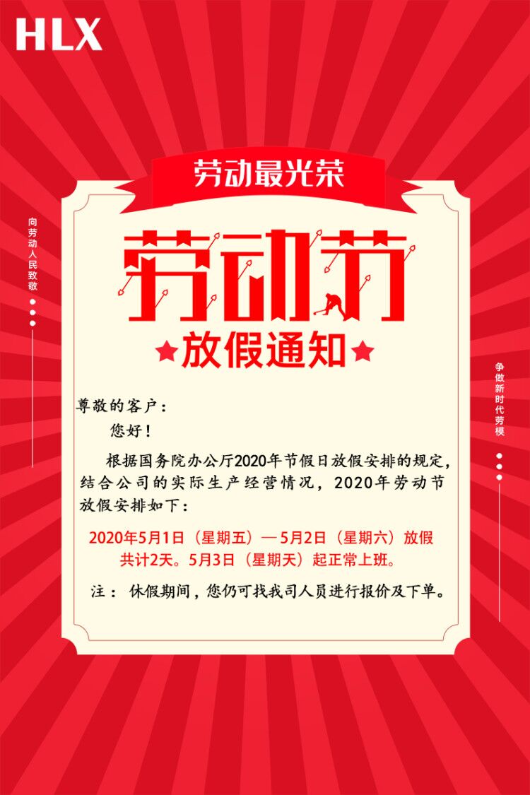 尊敬的客戶: 您好! 根據(jù)國務院辦公廳2020年節(jié)假日放假安排的規(guī)定,結合公司的實際生產經營情況,2020年勞動節(jié)放假安排如下: