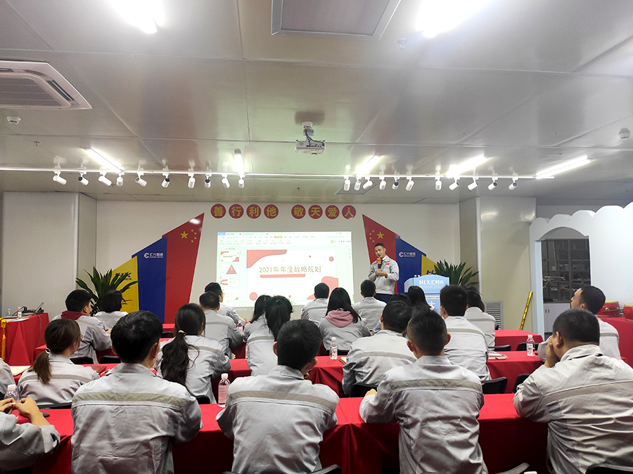 會議第五項議程,積分制度詮釋。積分制度開展將近一個月,在總經(jīng)辦的全力領(lǐng)導(dǎo)下,各部門持續(xù)且有效開展部門工作,充分調(diào)動了各部門工作的積極性,提高公司在同行業(yè)競爭力,增強公司團隊內(nèi)部戰(zhàn)斗力,加強公司在行業(yè)內(nèi)的創(chuàng)新力,為公司五年戰(zhàn)略規(guī)劃提供原動力。有效踐行了全體員工自上而下形成“我來干、搶著干、努力干”的工作作風(fēng),并進一步向新入員工宣導(dǎo)積分管理制度一系列準(zhǔn)則。 會議第6項議程,胡總經(jīng)理講話。首先胡總經(jīng)理從八大要素來解析2021年年度戰(zhàn)略規(guī)劃(戰(zhàn)略基礎(chǔ)、年度業(yè)績目標(biāo)、人力資源保障、運營、生產(chǎn)資源保障、綜合管理保障、財務(wù)資源保障、組織管理保障、人員配置系統(tǒng))等,進一步提高公司在同行業(yè)競爭力,增強公司團隊內(nèi)部戰(zhàn)斗力,加強公司在行業(yè)內(nèi)的創(chuàng)新力,為公司五年戰(zhàn)略規(guī)劃提供原動力;第二、胡總經(jīng)理談到:在2021年大市場環(huán)境下,各部門主管要認真審視公司內(nèi)部優(yōu)勢和劣勢、強項和弱項的基礎(chǔ)上,對當(dāng)前行業(yè)的競爭形勢和趨勢作出基本研判; 第三、貫徹公司對三個五年發(fā)展的要求和期望,結(jié)合公司運營情況,要學(xué)會分析外部環(huán)境的劣勢和威脅、內(nèi)部的優(yōu)勢和發(fā)展機會,確定公司發(fā)展方向,確保各項計劃順利落地; 第四、各部門管理執(zhí)行的各項工作、管理活動,包括任務(wù)制定、制度設(shè)立、日常管理,都必須始終不逾地圍繞戰(zhàn)略方針開展、貫徹和執(zhí)行; 第五、必須以“理順脈絡(luò)、根治病灶、提升效率”為目標(biāo),嚴格開展各項工作; 第六、匯利興耕耘行業(yè)20載,深耕西南10年,致力打造成為自動化輸送設(shè)備配件行業(yè)的一站式采購工廠,專業(yè)為行業(yè)客戶提供標(biāo)準(zhǔn)化、定制化、個性化、模塊化的專用高端精密零部件,愿全體員工拿出眾人拾柴的心勁兒、勇毅篤行的穩(wěn)勁兒一同去開辟公司的未來!助力公司前進!