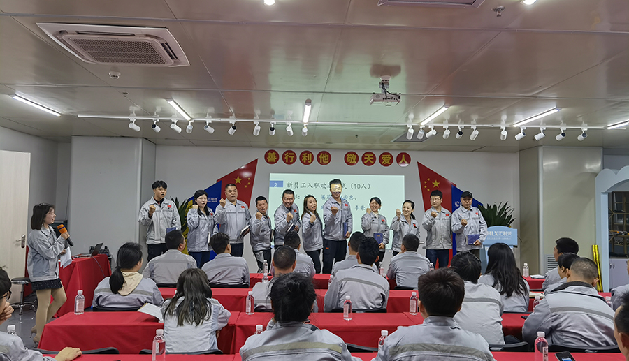 會議開始,三位高管敲響2021年征程的號角,鼓聲震天,士氣如虹,潛移默化鼓舞著戰(zhàn)友們奮勇前進(jìn),并以這種以評促進(jìn)、你追我趕的“激勵文化”,鞭策著員工們不斷爭先創(chuàng)優(yōu),推動企業(yè)發(fā)展內(nèi)生動力,從而形成“我來干、搶著干、努力干”的工作作風(fēng)。 會議第一項,企業(yè)文化展示。全體員工整肅衣冠,對倍加推崇的孝道、商道、人道鄭重鞠躬,莊嚴(yán)宣誓企業(yè)愿景:“成為行業(yè)優(yōu)秀的智能自動化產(chǎn)業(yè)鏈集成服務(wù)商”,企業(yè)使命:做受尊敬的好人,造受尊敬的產(chǎn)品,辦受尊敬的企業(yè),建受尊敬的平臺,企業(yè)精神“用情做人、用心做事”,團(tuán)隊精神“忠誠團(tuán)結(jié)、勤奮進(jìn)取”,工匠精神:創(chuàng)于手、精于工、智于器、匠于心、品于行等。 會議第二項。新員工入職歡迎儀式,培育新生力量,助力企業(yè)發(fā)展,增強(qiáng)企業(yè)核心競爭力,強(qiáng)化人才建設(shè)梯隊。由客服部經(jīng)理石樂歡為新入員工頒發(fā)紀(jì)念品。