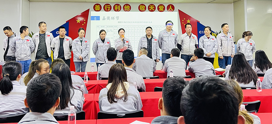 10月20日18點(diǎn)45分,匯利興西南工廠全體員工在匯利興學(xué)校召開9月月度會議,會議總結(jié)上月項(xiàng)目發(fā)展情況,規(guī)劃部署下月生產(chǎn)計(jì)劃,進(jìn)一步推進(jìn)公司戰(zhàn)略實(shí)施,由行政部主持。 會議前,由二位核心高管擊響士氣鼓,鼓舞士氣,凝心聚力,鼓舞著戰(zhàn)友們奮勇前進(jìn)和堅(jiān)決打勝仗的決心,并以這種以評促進(jìn)、你追我趕的“激勵文化”,潛移默化融于員工的日常工作中。 宣讀企業(yè)文化,向文化三道孝道、商道、人道鄭重鞠躬,并對本月新入員工進(jìn)行歡迎儀式。