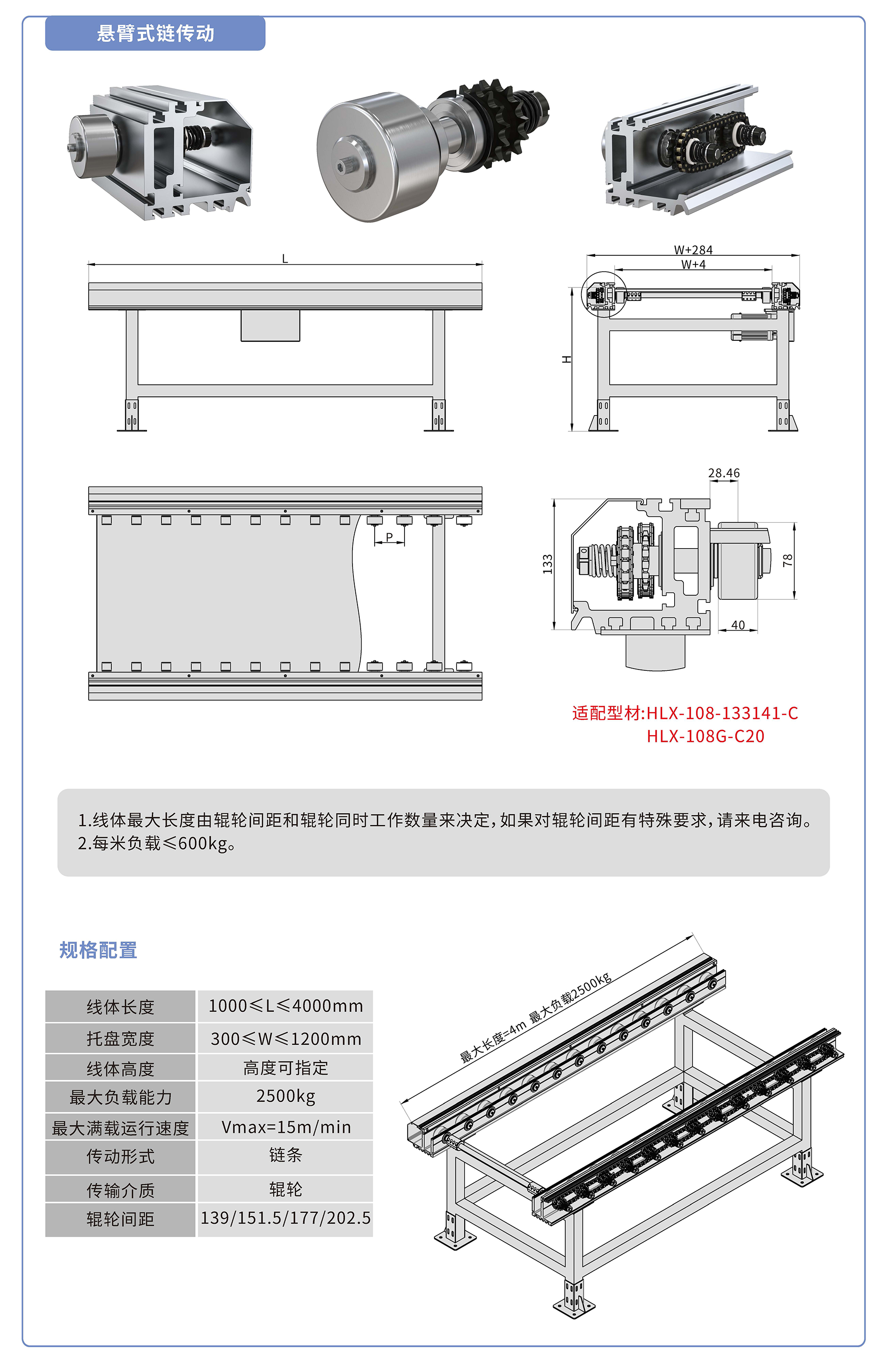 采用133141鋁型材,鏈輪傳動,鍍鉻滾輪鑲嵌銅套實現(xiàn)積放功能,負(fù)載2500kg/米,最大負(fù)載速度15M/min, 輪距139、151.5、177、202.5可選,適用托盤寬度300-1200mm,線體長度范圍1000-4000mm, 高度根據(jù)需求定制.