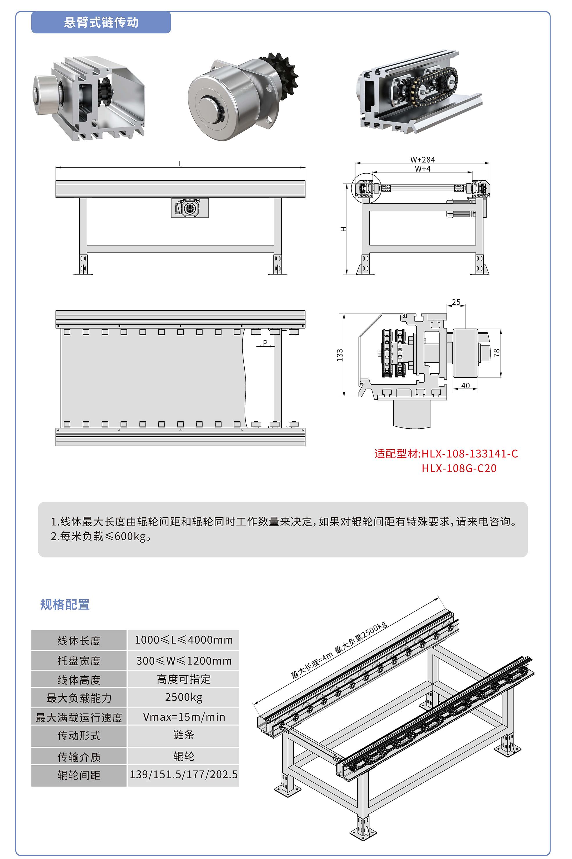 采用133141鋁型材,鏈輪傳動,鍍鉻滾輪鑲嵌銅套實現(xiàn)積放功能,負(fù)載2500kg/米,最大負(fù)載速度15M/min, 輪距139、151.5、177、202.5可選,適用托盤寬度300-1200mm,線體長度范圍1000-4000mm, 高度根據(jù)需求定制.