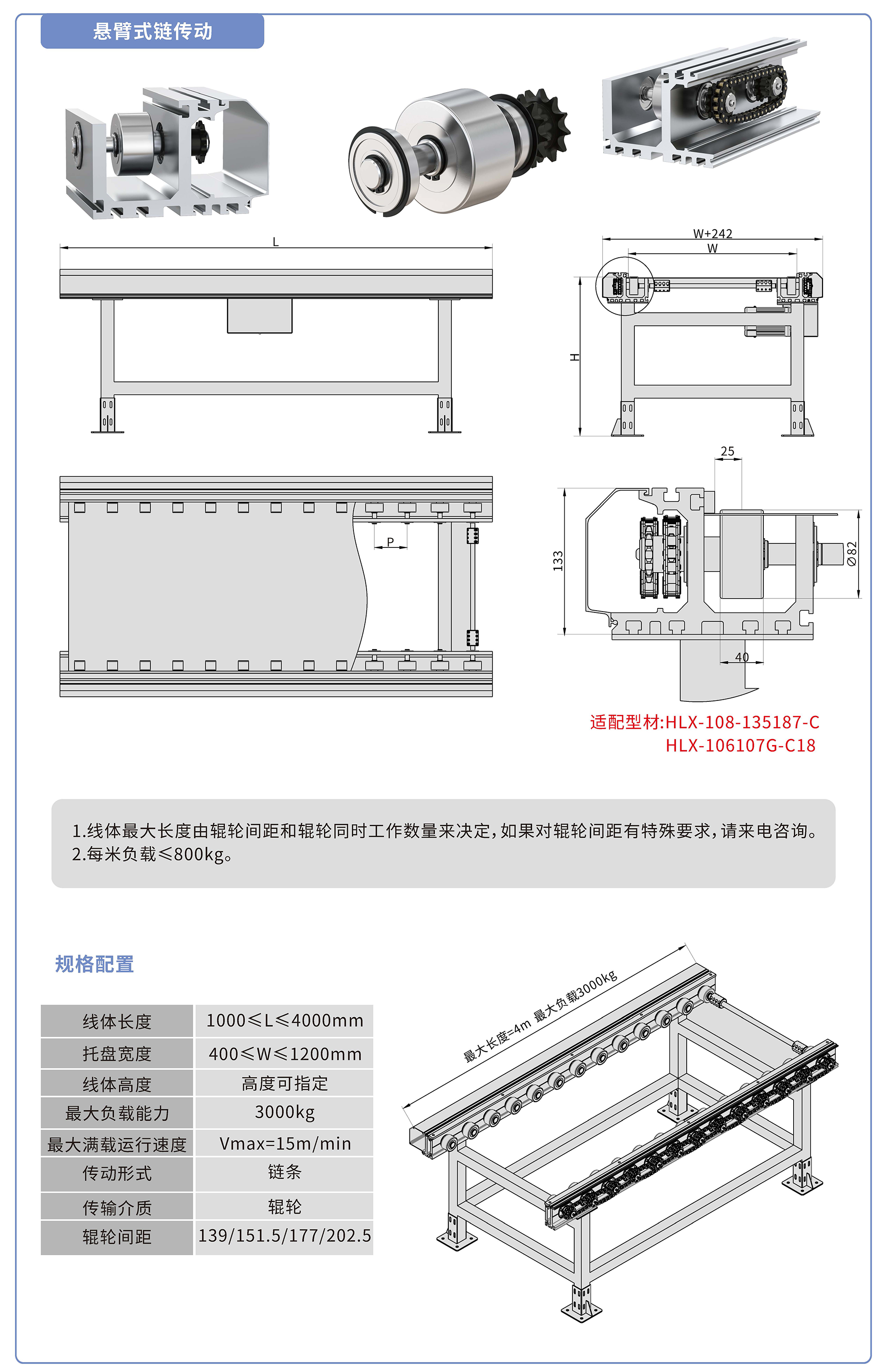 采用135187鋁型材,鏈輪傳動,鍍鉻滾輪鑲嵌銅套實現(xiàn)積放功能,負載3000kg/米,最大負載速度15M/min, 輪距139、151.5、177、202.5可選,適用托盤寬度400-1200mm,線體長度范圍1000-4000mm, 高度根據(jù)需求定制.