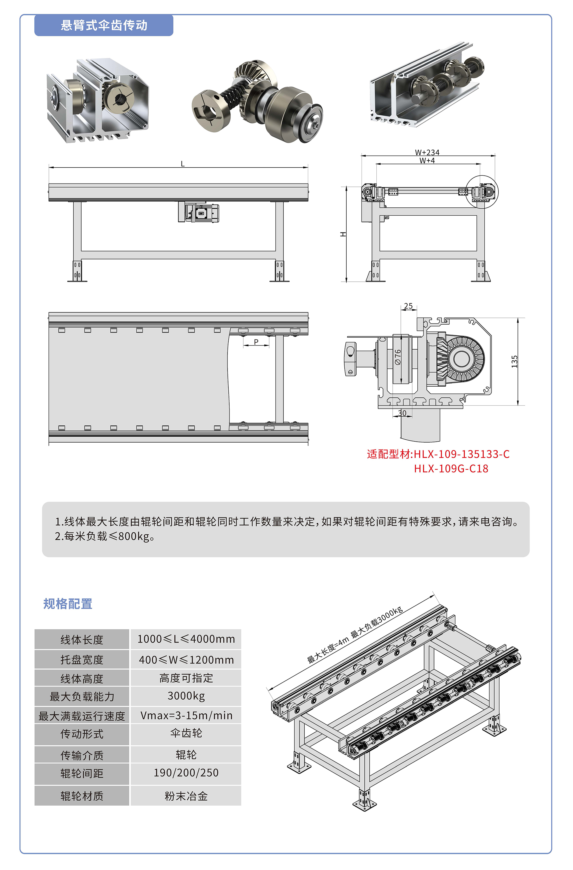 適配135133鋁型材,采用傘齒驅(qū)動,鍍鉻滾輪鑲嵌銅套實(shí)現(xiàn)積放功能,負(fù)載3000kg/米,最大負(fù)載速度15M/min, 輪距190、200、250可選,適用托盤寬度400-1200mm,線體長度范圍1000-4000mm, 高度根據(jù)需求定制.